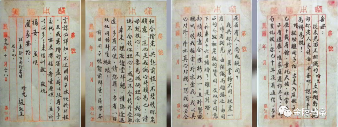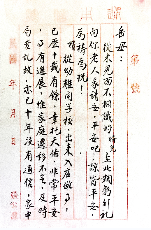 “从未见面不相识的婿儿在此鞠躬行礼,向你老人家请安,平安吧!谅皆平安,为祷为祝!婿从幼离开学校,出来入店做事,已历十载有余……我与珍儿,虽业务不同,但处一店,时有相见,由相识而趋接近,由同事的介绍和老板的赞同,及双方同意下,于本月十六日结婚了……”