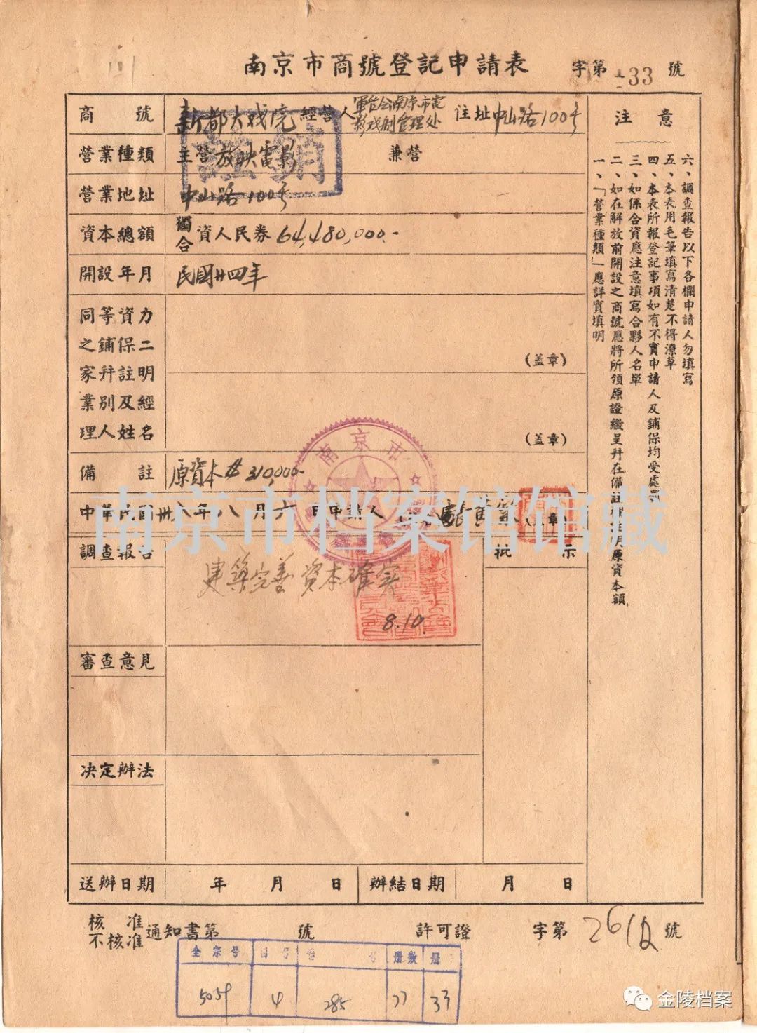 1949年新都大戏院商号登记申请表(南京市档案馆馆藏)