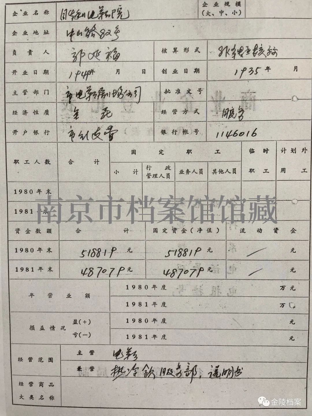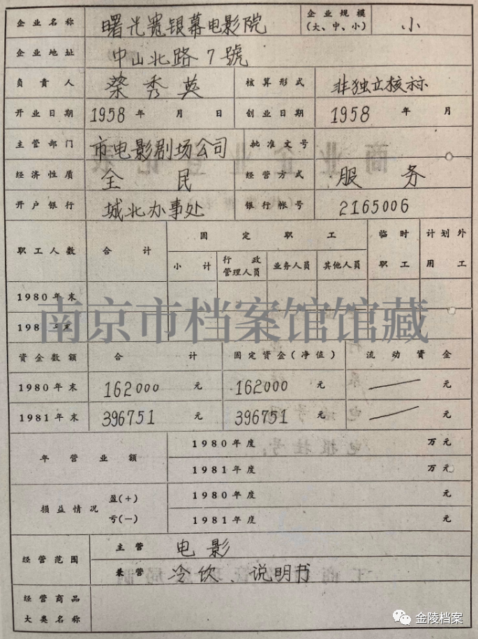 1982年曙光电影院商业登记表(南京市档案馆馆藏)