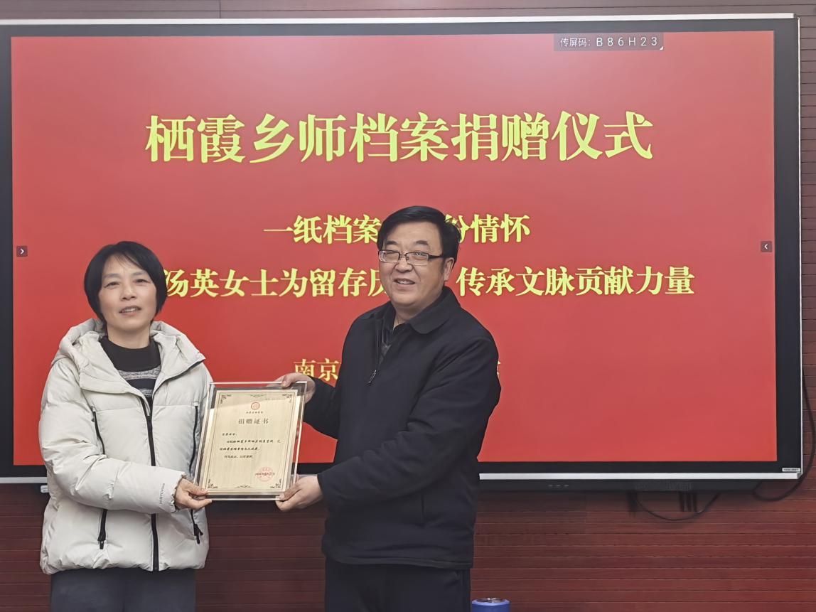 近日,市民汤英女士向栖霞区档案馆捐赠一批栖霞乡村师范学校历史资料,为本区地方教育史、乡村教育史研究再添珍贵实物。此次捐赠的栖霞乡师相关资料,承载着民国时期栖霞乡村教育的发展历程与办学记忆,具有重要的史料价值与文化价值。区档案馆已按规范完成接收、清点、登记与保管工作,并向汤女士颁发捐赠证书。