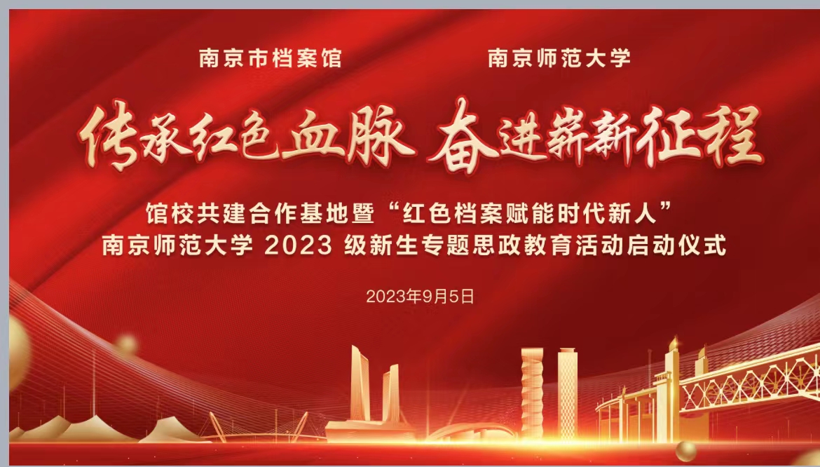 为全面贯彻党的二十大精神,深入学习贯彻习近平总书记关于档案工作的重要指示批示精神及考察江苏重要讲话精神,推动主题教育走深走实、见行见效,在新学期开学之际,南京市档案馆、南京师范大学共同举办的“传承红色血脉 奋进崭新征程”——馆校共建合作基地暨“红色档案赋能时代新人”南京师范大学2023级新生专题思政教育活动启动仪式,9月5日下午在南京市档案馆举行。