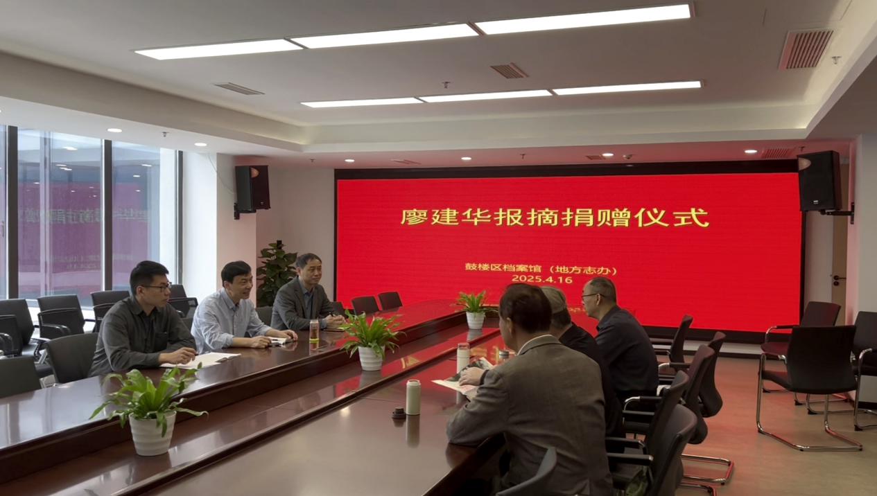 4月16日,鼓楼区档案馆举行廖建华报摘捐赠仪式,区档案馆馆长、区地方志办主任盛捷出席仪式并颁发捐赠证书。