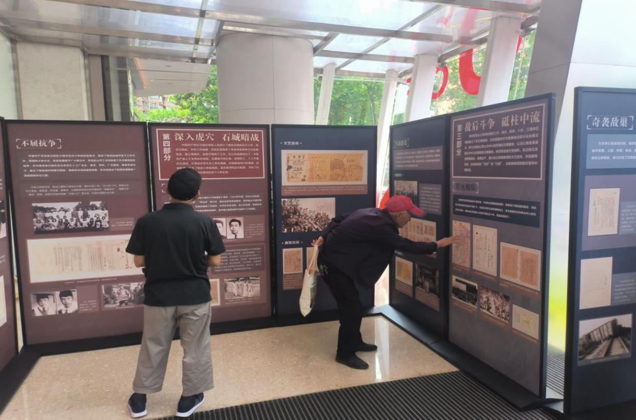 今年是中国人民抗日战争暨世界反法西斯战争胜利80周年。为更好讲述中国共产党领导南京人民浴血抗战的历史,弘扬伟大抗战精神,市档案馆在市委组织部联合栖霞区委组织部开展的“党旗飘扬映商圈 同城共筑惠民生”——南京党员专业志愿者服务基层行栖霞区专场活动中,开设党史学习教育专区,策划抗战主题流动展,让红色档案走进社区、走进大众。现场吸引了众多党员群众驻足观看、聆听讲解。